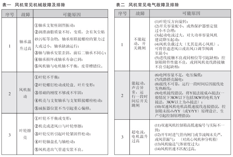 風機的調試及使用過程中可能會發生一些故障, 常見故障分為機械故障和電器故障。排除方法見表一和表二。